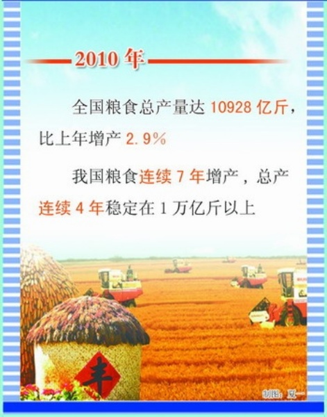12月3日,喜讯传来,2010年全国粮食总产量再次超过1万亿斤,达到10928亿斤,比上年增产2.9%。这已经是我国粮食连续7年增产、总产连续4年稳定在1万亿斤以上,对于保障国家粮食安全、保障农产品有效供给具有非常重要的意义,也有利于稳定社会物价和缓解通胀预期。