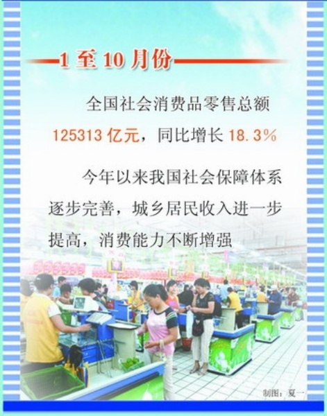 与此同时,在转变经济发展方式、改善民生、调整国民收入分配结构、增加城乡居民收入的宏观背景下,今年以来我国社会保障体系逐步完善,城乡居民收入进一步提高,消费能力不断增强。1至10月份,社会消费品零售总额125313亿元,同比增长18.3%。其中,10月份餐饮收入1681亿元,同比增长19.4%;商品零售12604亿元,同比增长18.5%。
