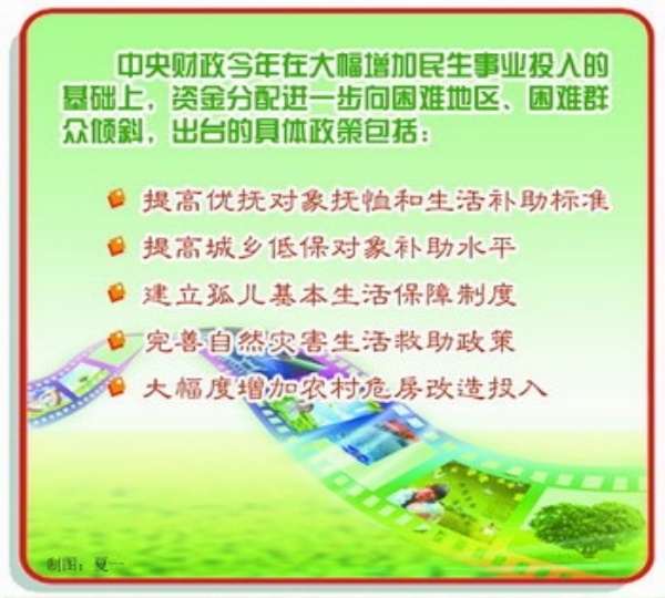 今年,中央财政出台的具体政策包括:一是提高优抚对象抚恤和生活补助标准。中央财政下达抚恤和生活补助资金211亿元,按可比的统计口径,比去年增加38亿元,增长22%。同时,在连续5年调标的基础上,从今年10月1日起,中央再次提高抚恤和生活补助标准,其中伤残抚恤金、“三属”定期抚恤金、“三红”定期生活补助标准均提高了10%。二是提高城乡低保对象补助水平。从今年1月1日起,中央财政分别按照城市低保对象月人均增加15元、农村低保对象月人均增加10元的标准,加大城乡低保补助资金投入,共下达补助资金635亿元,比去年增加94亿元,增长17%。三是建立孤儿基本生活保障制度。中央财政对东、中、西部地区分别按照每人每月180元、270元、360元的标准,共安排孤儿基本生活费用补助资金25亿元。另外,继续通过农村税费改革转移支付安排补助资金,支持地方做好农村五保供养工作。四是完善自然灾害生活救助政策。中央调整了特大自然灾害受灾群众生活救助政策,增设受灾群众过渡性生活救助项目,统一并适当提高了不同自然灾害农户倒损住房恢复重建中央补助标准,非地震灾害倒房补助标准提高43%,寒冷地区补助标准提高了1倍。同时,中央财政较大幅度地增加了受灾群众今冬明春临时生活困难救助资金规模。截至目前,今年中央财政已下达自然灾害生活救助资金113亿元,比去年增加37亿元,增长49%。五是大幅度增加农村危房改造投入。在2008年、2009年开展农村危房改造试点工作的基础上,今年中央将试点实施范围扩大到全国陆地边境县、西部地区县、国家扶贫开发工作重点县、国务院确定享受西部大开发政策的县和新疆生产建设兵团团场等贫困地区,重点支持120万农村(含新疆生产建设兵团团场连队)低保户、五保户和残疾人等困难家庭进行危房改造。中央补助标准为户均6000元,比2009年每户提高1000元。今年,中央共安排农村危房改造试点补助资金75亿元,比去年增加35亿元,增幅达87.5%。