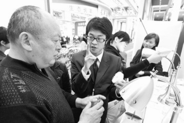 图为在第四届国际家博会上,一名工作人员向参观者介绍新款照明灯。 徐 勇摄(新华社发)