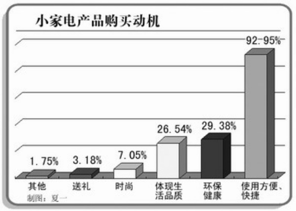 随着人们对小家电依赖性的日渐增强,需求不断加大,小家电产品的时尚化和精细化提供了广阔的市场空间。在对小家电产品消费调查中发现,环保健康和体现生活品质成为消费者选购小家电的最主要动机。