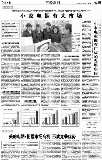 中国小家电业是中国家电行业中的重要组成部分,在30多年发展过程中,中国小家电业走过了一条“先外后内”的发展道路。在早些年,中国小家电产品大多以模仿为主,销售市场也以欧美市场等国家为主。而在“十一五”期间,中国小家电在全球出口市场保持了60%左右份额,其中2009年小家电产品出口额达到了138亿美元,比2005年增长了52%。毋庸置疑,中国已经成为全球最主要的小家电生产基地。