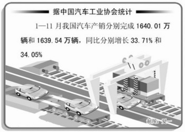 本报讯 中国汽车工业协会12月9日发布的最新统计显示,今年11月,我国汽车产销分别完成175.48万辆和169.70万辆,同比分别增长26.11%和26.86%。1至11月,汽车产销分别完成1640.01万辆和1639.54万辆,同比分别增长33.71%和34.05%,增速继续回落。根据11月份的产销数据,中国汽车工业协会预计2010年我国汽车产销将超过1800万辆。