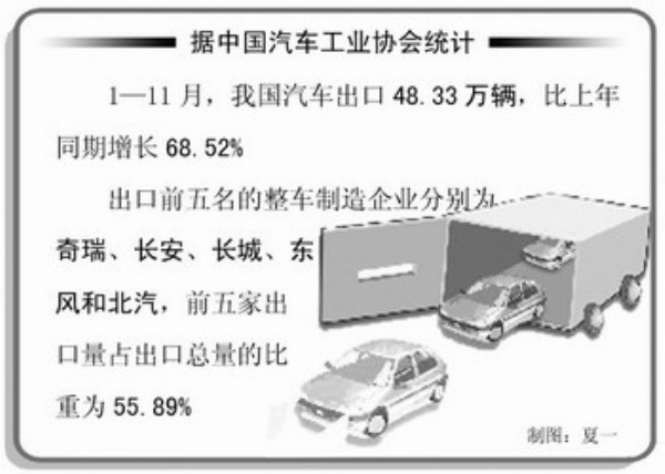 据中国汽车工业协会统计的汽车整车企业出口数据,11月,汽车企业出口4.89万辆,同比增速为28.11%。1至11月,汽车出口48.33万辆,比上年同期增长68.52%。1至11月,出口前五名的整车制造企业分别为奇瑞、长安、长城、东风和北汽,前五家出口量占出口总量的比重为55.89%。