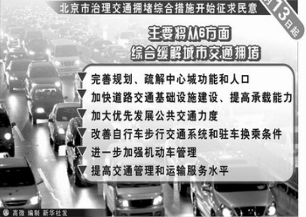 本报讯 记者徐文营报道:北京市治理交通拥堵综合措施从12月13日起开始征求市民意见,措施主要将从6个方面综合缓解城市交通拥堵。