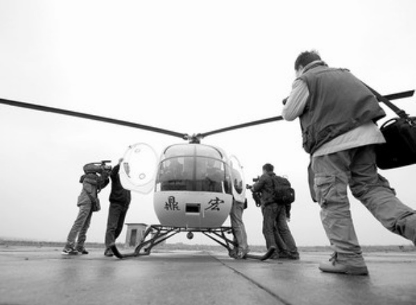 12月13日,安徽合肥骆岗机场内,记者们正在拍摄安徽首架通用直升机。 当日,安徽首架通用直升机在安徽合肥骆岗机场进行了首次验证性飞行。据介绍,本架直升机为安徽鼎宏通用航空公司购买,是安徽省购买的第一架通用直升机。 新华社记者 郭 晨摄