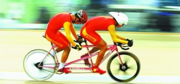 图① 12月13日,在场地自行车混合双人自行车追逐赛决赛中,中国组合鲍利峰/孙佳佳获得铜牌。