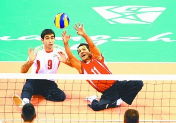 图③ 12月13日,伊朗队球员阿卜杜勒—法兹勒·穆哈拉姆·哈尼(右)在比赛中。当日,在男子坐式排球预赛中,伊朗队获得比赛胜利。 新华社记者 江宏景摄