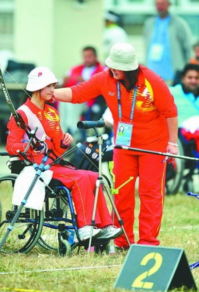图② 12月13日,在射箭女子反曲弓排名赛中,中国选手袁露露(左)的教练金玉兰为她拭去汗水。