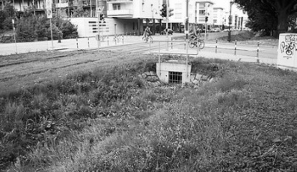 沃邦小区内只有一条公路。梅先生说,这是为了让大地透气,尽量减少路面的硬化。公路的旁边是有轨电车道。双轨仰卧在绿草丛中,绿草的下面铺设了减震材料。电车在轨道上驶过,就像人踩在地毯上一样,几乎听不到任何声响。这是为了不给两侧居民造成干扰。在轨道的另一侧,大约七八米的地方有一条沿街走向的渗水渠。水渠地表下面有储存水的水槽,水槽由高向低依次排开。一般下雨天,雨水几乎流不出小区。因为屋顶花园留住了部分雨水,剩余的通过管道进入渗水渠。下大雨或暴雨时,渗水渠还有排水的功能。
