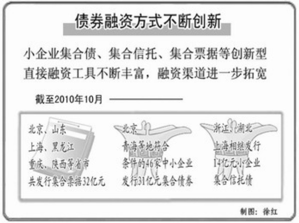 债券融资方式不断创新。小企业集合债、集合信托、集合票据等创新型直接融资工具不断丰富,小企业融资渠道进一步拓宽。截至2010年10月,北京、山东、上海、黑龙江、重庆、陕西等省市共发行集合票据32亿元;北京、青海等地符合条件的46家中小企业发行31亿元集合债券;浙江、湖北、上海相继发行14亿元小企业集合信托债,等等。知识产权等质押融资有新的突破。据统计,2007年以来,各类企业通过知识产权质押获得贷款超过200亿元。今年前10个月,专利权质押贷款融资金额达47.6亿元。