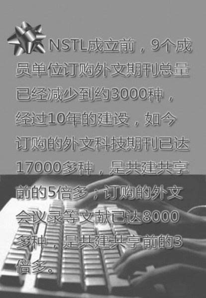 国家科技图书文献中心(NSTL)由科技部牵头,联合财政部、国家经贸委、农业部、卫生部和中国科学院共同组建而成,是我国实现科技图书文献共享的重要平台。NSTL成立10年来,以体制创新带动工作创新,按照“统一采购、规范加工、联合上网、资源共享”的运行机制,推进科技文献信息资源跨系统的共建和全国共享。目前NSTL已建设成为国家科技文献信息资源战略保障基地,为推动自主创新做出了重要贡献。