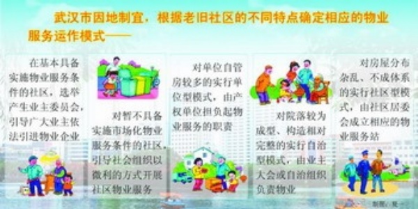 根据房屋、环境、配套设施和房屋产权的状况、居民的承受能力、服务需求以及消费意愿的实际情况,武汉市因地制宜,对老旧社区通过以社区为界,划分1个或多个物业服务区域,确定具体运作模式:在基本具备实施物业服务条件的社区,由街道办事处和房产部门督促指导召开业主大会,选举产生业主委员会,引导广大业主依法引进物业企业;对暂不具备实施市场化物业服务条件的社区,引导社会组织以微利的方式开展社区物业服务,缓解老城区社区物业服务缺位问题;对单位自管房较多的实行单位型模式,由产权单位担负起物业服务的职责;对院落较为成型、构造相对完整的实行自治型模式,由区域内居民选举居民代表或门栋长,组成业主大会或自治组织负责物业;对房屋分布杂乱、不成体系的实行社区型模式,由社区居委会成立相应的物业服务站。