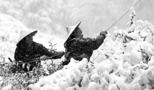 12月15日,浙江省诸暨市电力抢修队员在东白湖镇西丁村抢修电力线路。 当日,浙江迎来今年入冬以来第一场雪。浙江省诸暨市山区有两条供电线路被雪压断,诸暨市供电局立即启动抗雪应急预案,组织抢修队员赶赴山区抢修电力线路。 郭 斌摄 (新华社发)