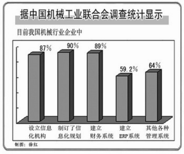 据中国机械工业联合会调查统计显示,目前我国机械行业有87%的企业设立了信息化机构,90%的企业在信息化开始前就制订了信息化规划。企业管理信息系统的应用也在不断深入,建立财务系统的企业达到89%,已经基本普及;建立难度较大的ERP系统的比例达到了59.2%;其他各种管理信息化系统的建成比例都超过了64%。