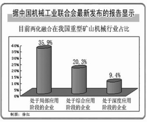 据中国机械工业联合会最新发布的《机械工业(重型机械行业)两化融合发展水平评估报告》显示,目前在我国重型矿山机械行业,有35.9%的企业两化融合处于局部应用阶段,处于综合应用阶段的企业比例占20.3%,处于深度应用阶段的为9.4%。