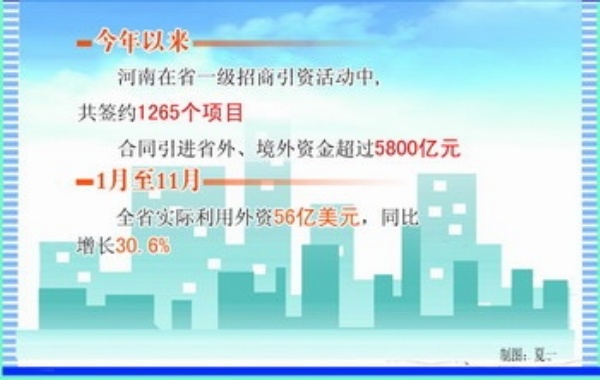 今年以来,河南在省一级招商引资活动中共签约1265个项目,合同引进省外、境外资金超过5800亿元。1至11月,全省实际利用外资56亿美元,增长30.6%,提前1个月完成全年目标。“十二五”期间,河南将进一步转变思想观念,增强开放意识,立足破解各领域发展难题,加快推进全方位、多层次、宽领域对外开放。