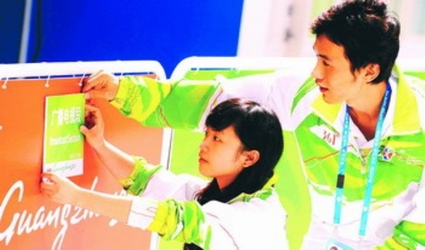 图① 12月16日,志愿者在游泳馆内张贴标识。