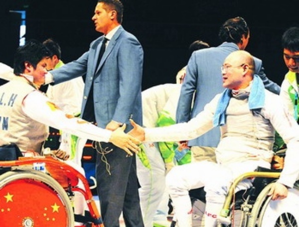 图④ 12月16日,两位选手在男子花剑团体决赛后握手致意。
