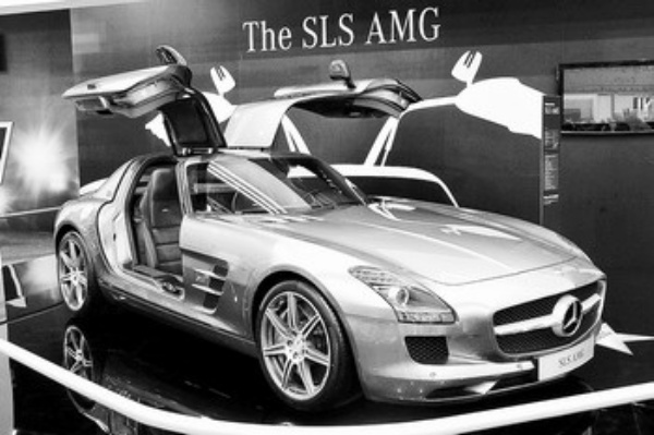 科威特2010国际车展日前在科威特国际展览中心开幕,共有20多家汽车和摩托车厂商参加本次展览。图为奔驰SLS AMG跑车在展台上亮相。 新华社发