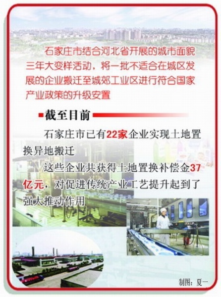 石家庄市是一座工业城市,在核心路段上聚集着纺织厂、卷烟厂、制药厂、拖拉机制造厂等企业,这些企业在城市中心发展,使城市环境受到很大影响。于是省、市两级政府决定结合全省开展的城市面貌三年大变样活动,将一批不适合在城区发展的企业全部搬到城郊设置的工业区,进行符合国家产业政策的升级安置,将腾出的城市中心区位置由企业经营三产,也可以通过政府经过土地统一拍卖后将其返还企业用以技术改造。到目前为止,该市已将常山纺织股份有限公司和金石化工投资公司等22家企业实现土地置换异地搬迁。这些企业共获得土地置换补偿金37亿元,对促进传统产业工艺提升起到了强大推动作用。