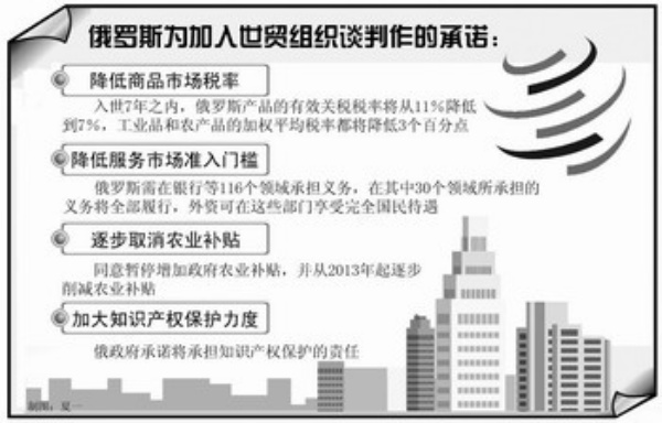 经过漫长的谈判,为了尽早加入世界贸易组织,俄罗斯在维护本国根本利益的基础上,对世贸组织成员做出了相关承诺,使俄在市场准入等方面满足了世界贸易组织的要求,从而具备了加入世贸组织的基本条件。
