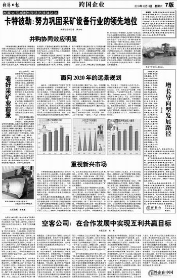 近年来,新兴市场改善基础设施,加快工业化进程,焕发出勃勃生机。卡特彼勒看好新兴市场增长预期。公司首席执行官奥伯赫曼表示,发展中国家经济持续增长已成为公司销量上升的关键。数据显示,2003年,卡特彼勒三分之一营收来自新兴市场,现在,这一比例已上升到了三分之二。2009年,卡特彼勒营收总额中,亚太和拉美地区的比例分别为22%和12%。今年第一季度,亚太地区的比例进一步增至27%,年增长率20%。第三季度,发展中国家的需求约占公司机械销量的半数。这些国家日益增长的基础设施建设刺激了建筑设备需求,大宗商品价格走高也催长了矿业机器需求。