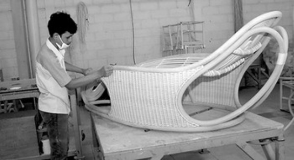 在卢卡斯先生的工厂里,因为藤制家具制作工艺比较简单,所以生产设备多年来基本上没有进行升级换代。工人们一如既往地根据客户需要,对藤条进行裁剪、定形、黏结和固定等手工操作。