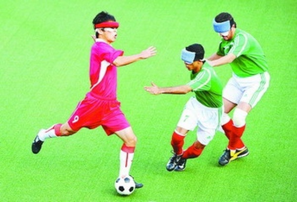 比赛开始后,会发声的球体在赛场上“哗啦啦”地滚动,运动员循声定位,只要碰触到球体,就会脚不离球,展现出高超的控球技术。站在球门后的引导员则不停地给运动员指引方向:“左边”,“右边”。在引导员的指引下,运动员带球向前,目标直指对方球门。