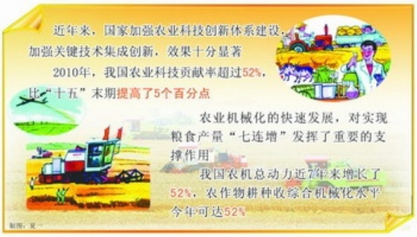 近年来,国家加强农业科技创新体系建设,加强关键技术集成创新,效果十分显著。2010年,我国农业科技贡献率超过52%,比“十五”末期提高了5个百分点。中国工程院院士、著名小麦专家于振文说,“这体现在,我们不仅培育和推广了一大批适合于农田的丰产优质品种,使良种覆盖率达到95%以上,还研究出高产优质高效栽培的关键技术,对新品种进行良种良法配套。这也体现在,灾害面前我们的防灾减灾应变技术及时对路,应变反应能力逐渐增强。”
