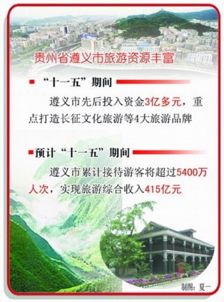 遵义市旅游资源丰富,“十一五”期间,按照“提升转折之城,打造会议之都”的城市定位,先后投入资金3亿多元,重点打造文化旅游、绿色生态旅游品牌,形成以遵义为中心的4条红色旅游、生态旅游线路,旅游业发展迅速。预计“十一五”期间,遵义市将累计接待游客5400万余人次,实现旅游综合收入415亿元,旅游业对GDP的贡献超过6%,成为支柱产业。