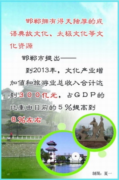 邯郸有得天独厚的成语典故文化、太极文化、赵文化、磁山文化、边区革命文化等文化资源,邯郸市提出,到2013年,文化产业增加值和旅游业总收入合计达到300亿元,占GDP的比重由目前的5%提高到8%左右。如何把文化资源优势转化为现实的产业优势,让历史文化“活”起来,让城市文化软实力“硬”起来?建设文化强市,做强文化产业,邯郸的任务还很艰巨。
