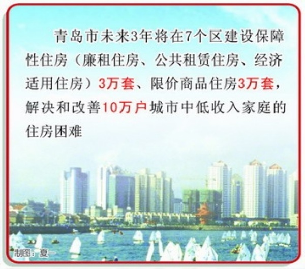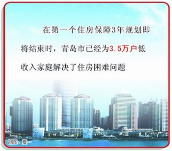 2007年,全国第一个城市住房保障规划《青岛市住房保障发展规划(2008—2010年)》出台,在第一个住房保障3年规划即将结束时,青岛市已经为3.5万户低收入家庭解决了住房困难问题。今年9月,《青岛市住房保障发展规划(2011—2013年)》出台。按照规划,青岛市未来3年将在7个区建设保障性住房(廉租住房、公共租赁住房、经济适用住房)3万套、限价商品住房3万套。新3年规划期结束时,青岛市将至少有10万户中低收入家庭住房困难得到解决、住房条件得到改善。