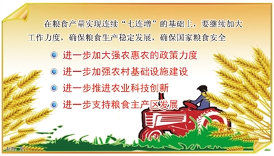 粮食产量“七连增”象征着米袋子满,菜篮子丰,农民钱袋子鼓。稳定粮食生产,为保供给、稳物价、保民生,保持国民经济平稳较快发展提供了基础支撑,为我国全面完成“十一五”计划确定的目标任务和实现“十二五”良好开局奠定了基础。如何在实现“七连增”的基础上,继续保持粮食生产稳定发展的好势头,成为全社会关注的话题。