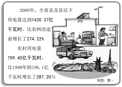 二是保证了农村用电供给,调动了农民用电积极性,推动了全省农村经济社会的发展。随着农村供电条件的改善,农村用电量大幅度增长。2009年,全省县及县以下用电量达到1430.27亿千瓦时,比1999年农网改造前增长了274.22%。农村用电量759.40亿千瓦时,比1998年的196.1亿千瓦时增长了287.20%。农网建设改造改善了农民生产生活条件,提高了劳动生产率,促进了农村经济社会的全面发展。