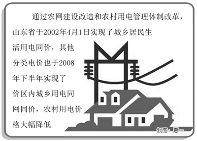 四是为农电体制改革和城乡用电同网同价奠定了基础,减轻了农民负担。农网建设改造为实行电力销售、抄表、收费、服务“四到户”,为实现城乡电网一体化管理奠定了坚实的基础。通过农网建设改造和农村用电管理体制改革,山东省于2002年4月1日实现了城乡居民生活用电同价,其他分类电价也于2008年下半年实现了价区内城乡用电同网同价,农村用电价格大幅降低。