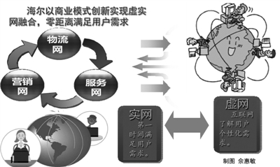 张瑞敏:虚网是互联网,用户在互联网上有需求,我们用实网来满足需求;对于海尔来讲,实网就是营销网、物流网、服务网。我们遍布全国各地的专卖店和社区店具有较强的竞争力,海尔农村市场的专卖店从县一直渗透到乡镇、村,在城市里有社区店,这是海尔非常有优势的资源。
