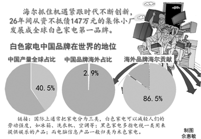张瑞敏:海尔目前是全球白色家电第一品牌。全球著名调查公司欧睿国际2010年最新的调查数据显示,海尔在全球白色家电品牌中名列第一,市场占有率为6.1%。