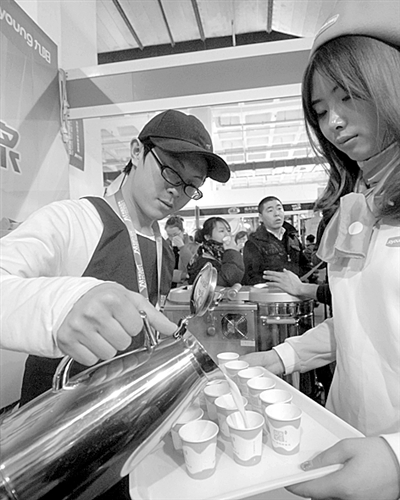 日前,在2010中国创业加盟品牌展览会上,厂商正准备将一款豆浆机磨好的豆浆分发给观展者品尝。当日,2010中国创业加盟品牌展览会在北京中国国际展览中心举行。 新华社记者 彭昭之摄