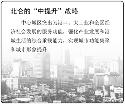 所谓“中提升”战略,是指中心城区突出为港口、大工业和全区经济社会发展的服务功能,强化产业发展和港城生活的综合承载能力,实现城市功能集聚和城市形象提升。