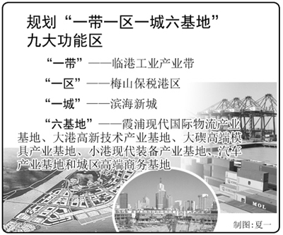 根据空间布局和产业特点,北仑规划了“一带一区一城六基地”等九大功能区,作为产业发展的大平台。“一带”即临港工业产业带,重点发展钢铁、石化、造纸、能源、船舶、新材料等产业;“一区”即梅山保税港区,致力于发展国际中转、国际采购、国际配送、转口贸易和出口加工等核心功能;“一城”即滨海新城,既为梅山保税港区配套高端商务和生活居住功能,又是北仑城市发展的重点拓展区块;“六基地”分别是霞浦现代国际物流产业基地、大港高新技术产业基地、大碶高端模具产业基地、小港现代装备产业基地、以吉利汽车为主体的汽车产业基地以及城区高端商务基地。