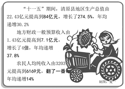 “十一五”期间,清原县地区生产总值由22.43亿元提高到84亿元,增长了274.5%,年均递增30.2%;地方财政一般预算收入由1.43亿元提高到7.1亿元,增长了4倍,年均递增37.8%;农民人均纯收入由3203提高到6169元,翻了一番,年均递增14%。