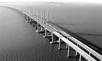12月22日,青岛海湾大桥主线合龙贯通,这标志着大桥一期主体工程基本结束。建成后的青岛海湾大桥全长超过41.58公里,通车后,青岛至黄岛的路程就此缩短近30公里,比目前走胶州湾高速节省时间20分钟。 这是2010年12月8日航拍的建设中的青岛海湾大桥。 赵鲁英摄 (新华社发)