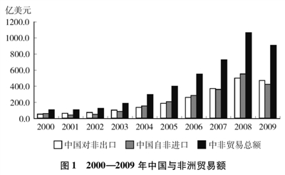 贸易是中非经贸合作最初的形式。伴随着中非关系的发展和交往的增多,中非贸易规模日益扩大。1950年,中非双边贸易额仅为1214万美元,1960年达到1亿美元,1980年超过10亿美元。2000年迈上百亿美元台阶后,中非贸易呈现快速增长势头。2008年突破了1000亿美元,其中中国对非洲出口508亿美元,自非洲进口560亿美元。2000年至2008年,中非贸易年均增长率高达33.5%,占中国对外贸易总额的比重由2.2%升至4.2%,占非洲对外贸易总额的比重由3.8%升至10.4%。2009年,虽然受国际金融危机影响,中非贸易额下降到910.7亿美元,但中国在当年首次成为非洲第一大贸易伙伴国。随着世界经济复苏,中非贸易呈现良好的恢复发展态势。2010年1月至11月,中非贸易额达1148.1亿美元,同比增长43.5%。