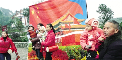 12月24日,来自北京和四川的摄影家来到都江堰市向娥乡棋盘村,为村民拍照留念。新居前合影,村民们最喜欢的背景布是北京天安门。 本报记者 邓 维摄