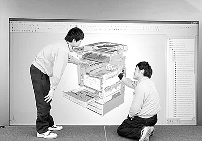 因此,为了能够进一步缩短评估时间、简化评估方法,富士施乐采用与实物大小相同的三维CAD模型,运用仿真技术,通过在检验人员身上安装摄像头和感应器取代人体模型,对研发中的产品进行评估。就像检验人员在真实机器上进行评估一样,虚拟模型会根据佩戴感应器的检验人员的动作进行移动,同时模拟显示从检验人员的视线所能看到的正确画面。