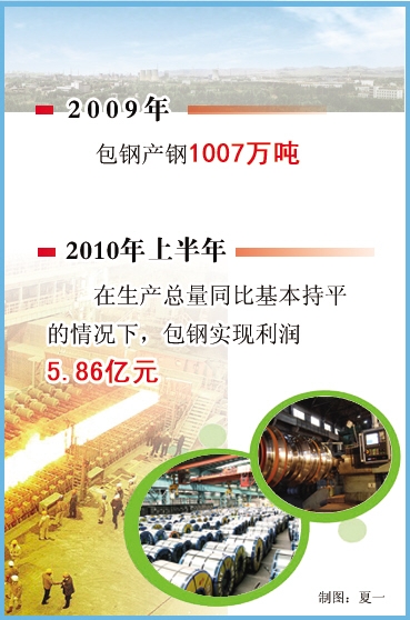 包头因矿而建,以钢闻名。围绕白云鄂博铁矿的开采冶炼,以昆都仑河为界,河西建包钢,河东建起了包头。从此,一车车钢铁产品从这里发往祖国的四面八方,南京长江大桥、葛洲坝、亚运村、奥体中心、国家大剧院……处处留下了包钢的产品。2009年,包钢产钢1007万吨。今年上半年,在生产总量同比基本持平的情况下,包钢实现利润5.86亿元。
