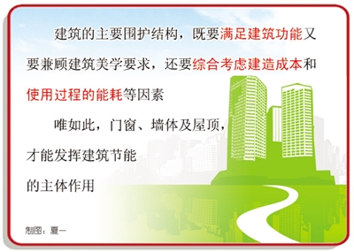 在建筑物的四大围护结构门窗、墙体、屋顶和地面中,以面积与能量损失率计,排首位的是门窗,其次是墙体,第三是屋顶。从门窗跑掉的能量约占建筑使用过程总能耗的50%,其能耗是墙体的4倍、屋顶的5倍、地面的20多倍。