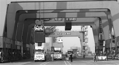 集装箱运输车在厦门港海沧区装载集装箱。 张永定摄