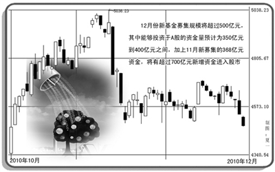 统计显示,12月已经成立的21只新基金合计募集了390亿元。业内人士分析认为,加上即将成立的新基金,12月份新基金募集规模将超过500亿元,甚至可能接近600亿元。其中能够投资于A股的资金量预计为350亿元到400亿元之间,再加上今年11月新募集的368亿元资金,基金在短短两个月内有超过700亿元新增资金进入股市,并有望缓解股市资金面的压力。